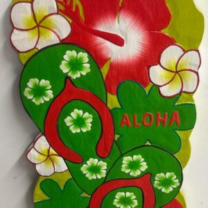 Handmade Aloha Wall Art, Lime, Green & Pink, Fair Trade, Hand Carved, 50cm L X 27cm W